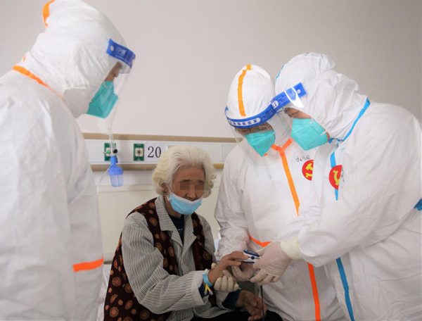 2月5日,一位94岁的老奶奶,被转运至救治中心。老人一直在间断的发热,医护人员非常关心老人的病情,于凯江组织联合会诊,制定康复期血浆等治疗方案,还经常到病房里查看老人的呼吸功能,问老人吃得好不好,睡得香不香,心情怎么样。