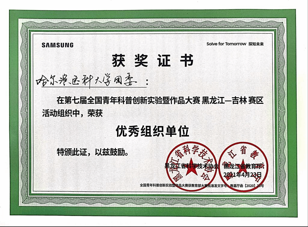 另外,哈尔滨医科大学团委荣获优秀组织单位,团委马文超、姜欢荣获优秀组织个人奖。