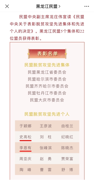 为大力弘扬脱贫攻坚战精神,激励广大盟员为建设社会主义现代化强国、实现中华民族伟大复兴创造新的更大业绩。6月2日,民盟中央关于表彰脱贫攻坚先进集体和先进个人大会在京举行,大会授予全盟479名盟员“民盟脱贫攻坚先进个人”称号,民盟哈尔滨医科大学委员会主委李恩有、副主委史高松荣获本项荣誉称号。