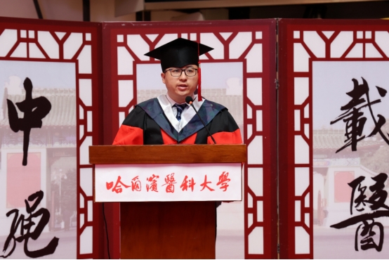 临床医学内科学心血管病博士研究生孙长斌代表2020届毕业生发言,他在哈医大度过了本、硕、博12年的学习时光,见证了学校的快速发展,感动于学校在疫情阻击战中的无畏与勇敢,领悟了仁心仁术的大医精神,他祝福母校桃李芬芳,再谱华章!
