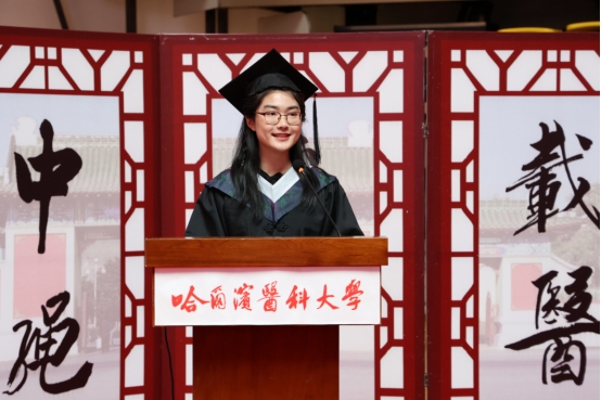 临床医学专业本科生赵娜代表2021届毕业生发言,她感恩于母校师长的培养,留恋学校的一草一木。哈医大的成长时光里,母校给予提升自我的机会,认知自我、珍惜机遇;馈赠更无价的精神财富,独立思考、勇于开拓;教诲要秉承校训,做新时代的担当者。他们将带着母校赋予他们独立思考的能力、医者仁心的品格、严谨求学的态度、一往无前的勇气,走上新的人生旅途。她祝愿母校春风化雨,誉满五洲。