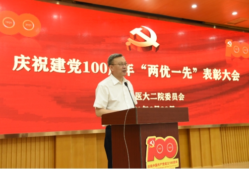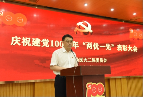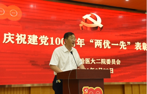 时代楷模彰显时代精神,伟大事业需要榜样引领。在建党100周年来临之际,为弘扬奋斗精神,表彰先进楷模,6月30日,哈医大二院庆祝建党100周年“两优一先”表彰大会在办公楼大会议室隆重召开,对涌现出的优秀共产党员、优秀党务工作者和先进党支部进行表彰。哈尔滨医科大学党委书记张斌,党委副书记贺景平,校党委常委、组织部部长王小雪莅临大会。哈医大二院院领导班子、抗击疫情医疗队员代表、优秀党务工作者、优秀共产党员、获奖集体等参加了表彰大会。院长、党委副书记焦军东主持会议。全院各支部全体党员线上收看。