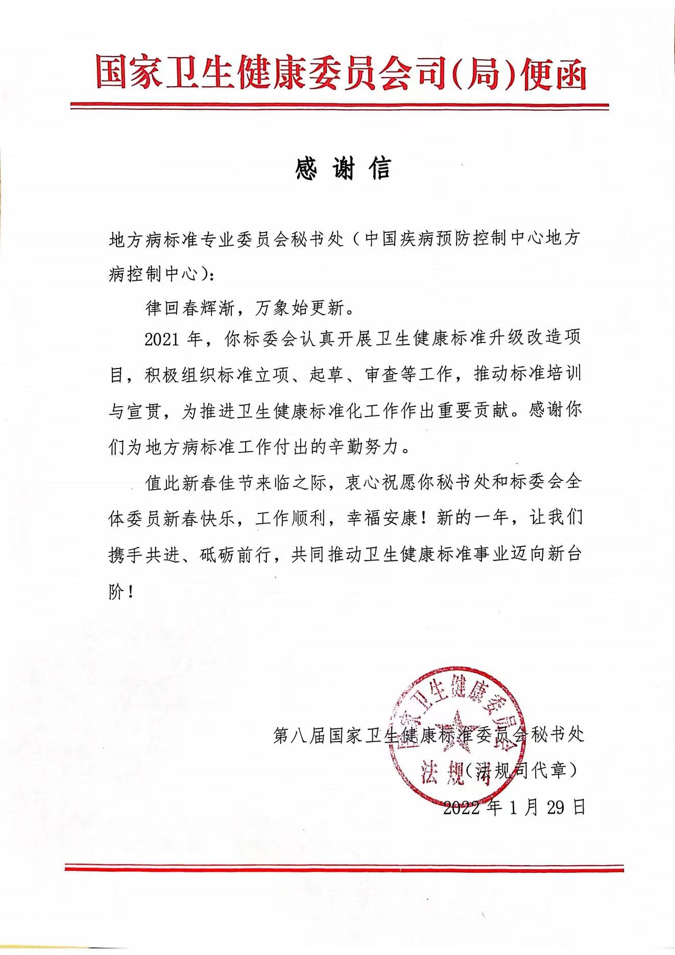 国家卫生健康标准委员会感谢并表扬地病中心2021年卫生标准工作