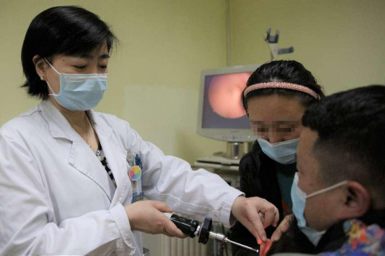 耳鼻喉科专家张天虹教授正在用耳内镜为一名听力障碍的儿童检查耳膜。