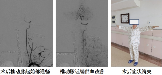 经过完善的术前准备,全麻状态下手术开始。李永利带领团队先用微导丝引领微导管进入颈升动脉,绕了几个圈后进入椎动脉内,然后在椎动脉内逆血流方向往回走,找到并通过闭塞段。使用球囊对闭塞段进行扩张,扩张后隐约可见血管再通的影像,再从闭塞近端正常血管内输送一枚支架将闭塞段血管完全支撑起来。手术非常顺利,术后检查显示,椎动脉供血明显充沛,患者次日头晕等症状明显好转。