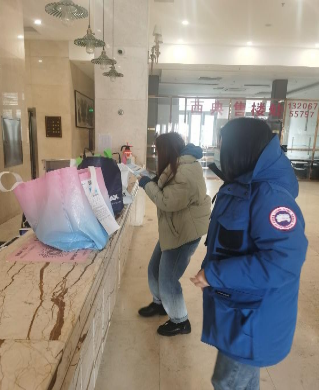 基础医学院辅导员刘爽、毕丽佳为隔离酒店的学生送去生活用品