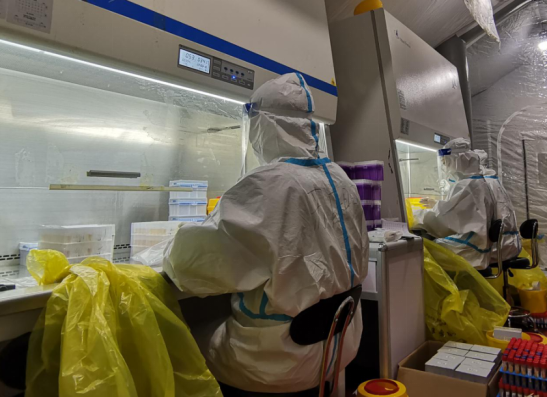 哈尔滨市方舱核酸检测实验室内,哈医大一院核酸检测医疗队苏广明,史婧正在加样。哈医大一院移动核酸检测团队当日完成1.6万管核酸检测。