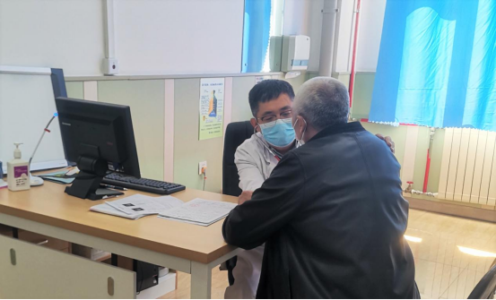 “老大爷,我们是无假日医院,您检查完就回来找我,我一整天都在。”呼吸科于世寰教授在诊室内为一名患者诊查身体。