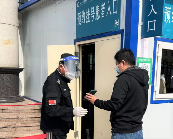 “把好入门第一关,五一我在岗。”保安认真查验患者的健康码、核对身份证信息48小时核酸证明。