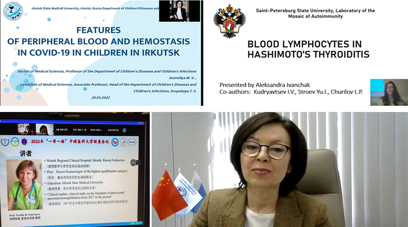 来自中俄双方的10位顶级专家进行了学术报告,聚焦了血液系统疾病及相关领域的诊疗新进展。在上午的学术会议中,上海瑞金医院副院长赵维莅教授、北京大学人民医院血液病研究所副所长张晓辉教授、俄罗斯伊尔库茨克国立医科大学副校长Tamara S Krupskaia教授、俄罗斯圣彼得堡大学Ivanchak Aleksandra教授、北京协和医院朱铁楠教授分别进行了关于DLBCL分子诊疗进展、异基因造血干细胞移植治疗老年白血病、COVID-19对儿童血液影响、桥本氏甲状腺炎外周血淋巴细胞特点以及ITP诊治进展的讲座。在下午的会议中,中山大学血液病研究所所长李娟教授、哈医大一院副院长李悦教授、俄罗斯伊尔库茨克国立医科大学Natalia R. Solovkova教授、中国医学科学院血液学研究所魏辉教授、北京大学第三医院景红梅教授就高危骨髓瘤、肿瘤心脏病学、造血肿瘤的发病及死亡率、CEBPA双突变AML及自体移植治疗淋巴瘤进行了深入的讲解。其中来自俄罗斯专家和李悦教授的讲座聚焦血液病领域交叉学科及热点问题,包括COVID-19对儿童血液及止血的影响、桥本氏甲状腺炎外周血淋巴细胞的特点以及肿瘤心脏病学发展历程及热点问题。