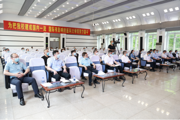 会议以线上线下视频结合方式进行,校领导班子成员、厅级干部,机关职能部门负责同志,机关副处级干部,各党委、直属党总支领导班子成员、副处级以上干部,附属医院各职能部门负责同志,科室主任、护士长代表共700余人参加会议。