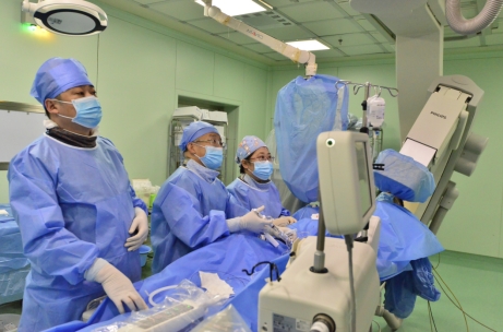 哈医大二院心内科副主任候静波教授(右)带领刘慧敏主任医师(中)等医生进行手术