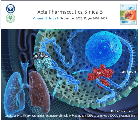 近日,药学院梁海海教授团队在特发性肺纤维化研究领域取得最新进展,研究成果《LncRNADACH1protects against pulmonary fibrosis by binding to SRSF1 to suppressCTNNB1accumulation》以封底文章发表在我国领军期刊《Acta Pharmaceutica Sinica B》2022年9期(IF=14.903)。