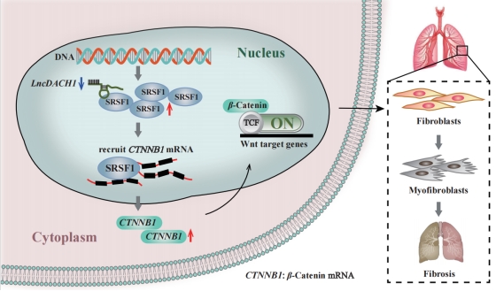 在本项目中,研究者观察到LncDACH1敲除小鼠发生自发性肺纤维化。过表达LncDACH1可显著减轻博莱霉素(BLM)诱导的小鼠肺纤维化,包括炎症浸润、胶原沉积及肺组织重构等病理改变。机制研究表明,LncDACH1通过与SRSF1蛋白结合并降低其表达,抑制SRSF1介导的CTNNB1mRNA累积,阻止wnt/β-catenin通路激活继而减轻肺纤维化。由于lncRNAs的长度较长,同源性较低,导致许多在动物实验中作用较好的lncRNAs无法转化应用。而本研究发现,LncDACH1的人源保守片段LncDACH1(835-1251)具有与全长序列相似的功能,在人源肺成纤维细胞中亦具有抗纤维化作用。该研究证明LncDACH1可能成为一种新型特发性肺纤维化治疗策略。