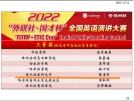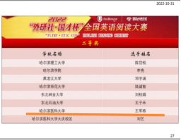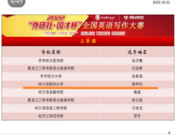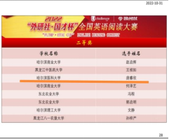 在备赛及比赛过程中得到了学校各院系部门的大力推动和各级领导的大力支持。经过激烈角逐,我校学生从来自省内多所高校的241名选手中脱颖而出,取得了写作一等奖1名、三等奖1名,阅读二等奖2名,演讲三等奖1名的优异成绩,充分展现了哈医学生积极向上、志存高远、昂扬向上的精神面貌。