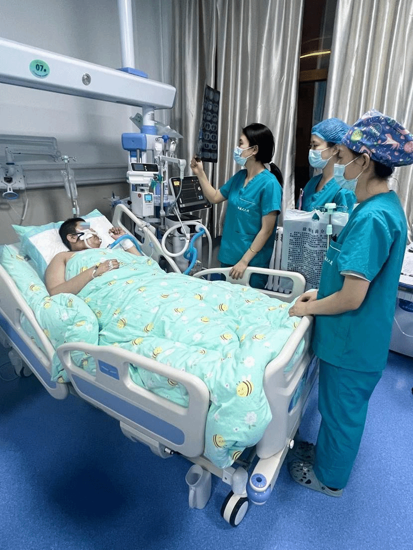 2022年12月28日16时30分许,68岁的张大爷(化名)由于新冠病毒感染导致重度肺炎,血氧最低时73%,急转入哈医大一院重症医学科治疗。经过杨威教授团队4天的救治,2023年1月1日13时许,张大爷成功脱离了高流量氧疗,从重症医学科转回到普通病房,接受后续治疗。转出前,张大爷高兴地对为他治疗的重症医学科医护团队表示感谢。