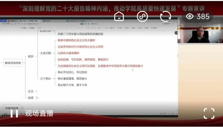 高彦辉从党的二十大报告的前言、正文和结语三个部分出发,对党的二十大报告进行了详细解读,并从中凝练出发展、人民、推进、安全、现代化等20个关键词和新征程、伟大建党精神、踔厉奋发、勇毅前行等7个重点信息。他强调,在建设社会主义现代化国家的新征程上,面对复杂的工作任务,我们要高举中国特色社会主义伟大旗帜,弘扬伟大建党精神,以奋斗向上、勇敢坚毅的姿态,踔厉奋发,勇毅前行,坚持守正创新、自信自强,团结奋斗实现全面建设社会主义现代化国家的伟大目标。