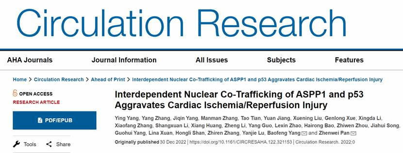 药学院杨宝峰院士团队在心肌缺血再灌注损伤领域取得新进展,研究成果论文《Interdependent Nuclear Co-Trafficking of ASPP1 and p53 Aggravates Cardiac Ischemia/Reperfusion Injury》于2022年12月30日发表于高水平期刊《Circulation Research》(IF:23.218)。该研究首次发现并阐明ASPP1促进心肌I/R损伤的潜在分子机制,为该疾病的临床防治提供了新的思路与治疗靶点。