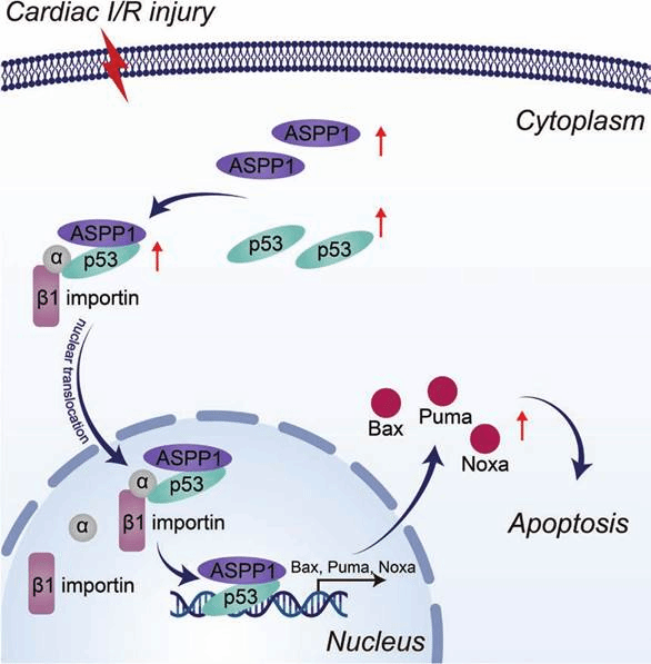 杨宝峰院士团队首先发现心肌I/R损伤时,心肌细胞中ASPP1与p53表达双双升高,结合增多,且在细胞核内共定位也随之增多。ASPP1可提升细胞核内的p53水平。同时,H/R处理后,敲减p53使ASPP1在心肌细胞质中聚集。敲减importin-β1阻断p53的经典入核途径导致ASPP1和p53均在细胞质中聚集。这些发现首次明确ASPP1与p53核转位存在相互依赖关系,ASPP1与p53结合是促进p53核转位的关键因素。研究团队进一步发现心肌特异性过表达ASPP1的转基因小鼠心肌细胞中p53细胞核定位增多,进而通过促进心肌细胞凋亡加重小鼠心肌I/R损伤,而ASPP1基因敲除发挥心肌保护作用。阻断ASPP1与p53结合的多肽分子能够减少p53进入细胞核,减轻心肌细胞损伤,发挥心肌保护作用。