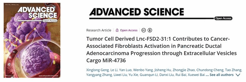近日,哈尔滨医科大学附属第一医院孙备教授团队在国际知名学术期刊《Advanced Science》(中科院1区,IF: 17.521)上,在线发表了题为“Tumor Cell Derived Lnc-FSD2-31:1 Contributes to Cancer-Associated Fibroblasts Activation in Pancreatic Ductal Adenocarcinoma Progression through Extracellular Vesicles Cargo MiR-4736”的研究成果。该项研究全部在哈尔滨医科大学附属第一医院肝脾外科教育部重点实验室实施并完成。哈尔滨医科大学附属第一医院肝脾外科教育部重点实验室为本文第一单位,哈尔滨医科大学附属第一医院孙备教授、陈宏泽教授为共同通讯作者,哈尔滨医科大学附属第一医院耿兴隆,李乐为共同第一作者。