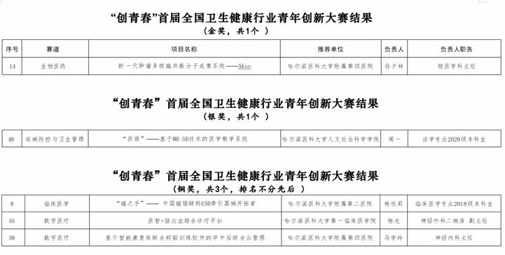 近日,由共青团中央青年发展部、国家卫生健康委文明办、中国青年创业就业基金会联合举办的第八届“创青春”中国青年创新创业大赛卫生健康行业专项赛暨首届全国卫生健康行业青年创新大赛落下帷幕。我校青年表现优异,获得国家级金奖1项,银奖1项,铜奖3项,优秀奖12项。