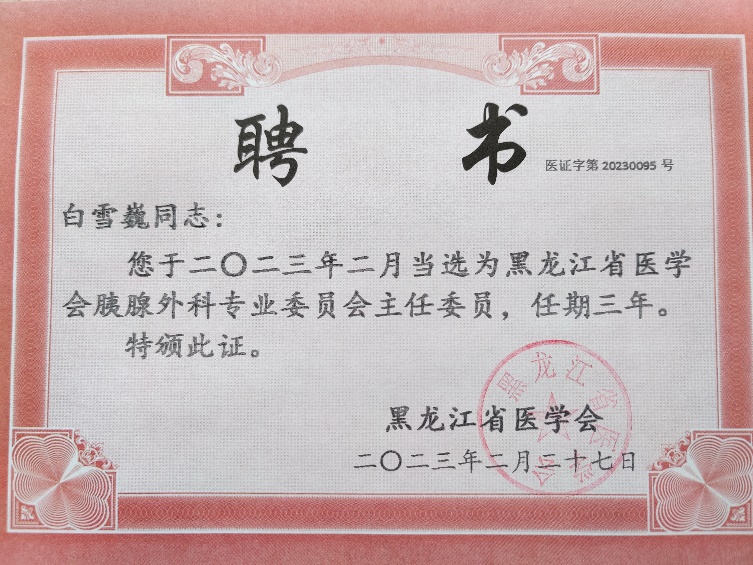哈医大一院白雪巍教授当选黑龙江省医学会胰腺外科专业委员会主任委员