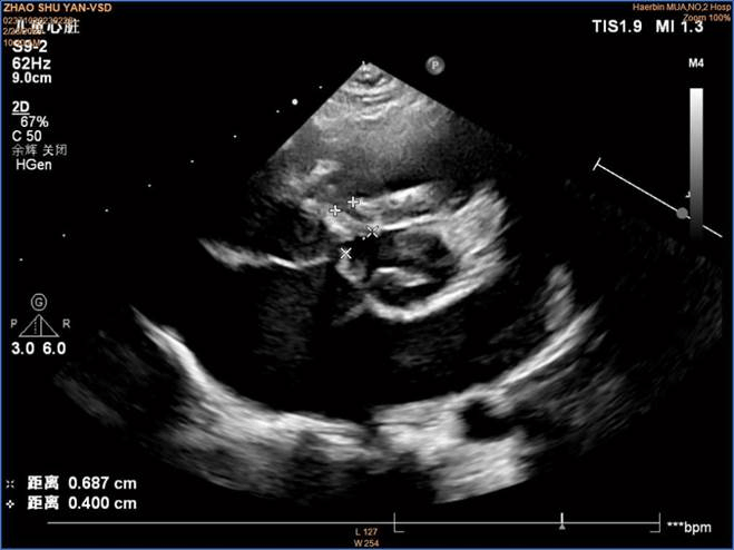 入院后经过全面检查发现心脏杂音,心脏超声证实室间隔缺损,缺损直径约为4.4 mm,确诊为室间隔缺损合并膨出瘤。自然闭合的可能性几乎没有,符合介入封堵手术治疗指征。