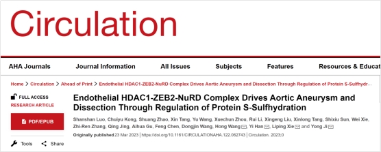 2023年3月23日,我校季勇教授团队发现内皮细胞蛋白巯基硫化修饰在主动脉瘤/夹层中的关键作用,研究成果论文《Endothelial HDAC1-ZEB2-NuRD Complex Drives Aortic Aneurysm and Dissection Through Regulation of Protein S-Sulfhydration》发表在心血管领域权威期刊Circulation (IF=39.922)。