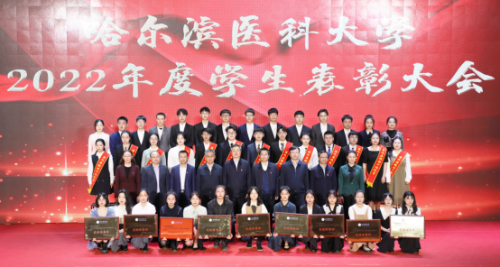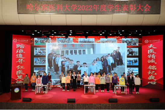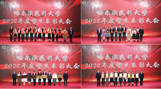 学生处处长徐娟宣读《关于表彰哈尔滨医科大学“2021-2022学年三好学生、优秀学生干部、先进班集体”的决定》《关于表彰哈尔滨医科大学“第三届十佳寝室”的决定》《关于表彰哈尔滨医科大学“第九届校园十佳之星”的决定》。