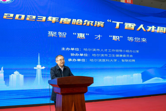 4月12日,哈尔滨市“丁香人才周”——哈尔滨医科大学专场招聘活动在学校公共卫生学院阳光大厅举办。学校党委书记张学在宣讲会上代表学校致辞。