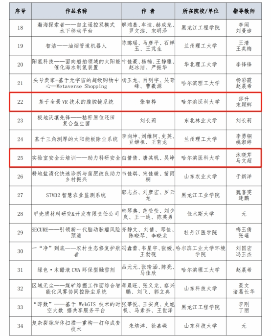 赛事期间,各参赛团队不断推敲、细致优化,在激烈的角逐中一路披荆斩棘,取得傲人成绩。其中,第二临床医学院《基于全景VR 技术的腹腔镜系统》及药学院《实验室安全云培训——助力科研安全》两个项目均获得国家级三等奖,校团委马文超老师荣获“突出贡献奖”。诸多荣誉的取得,是对我校全体师生凝心聚力、开拓创新、锐意进取的良好精神风貌的肯定与激励。校团委将继续高度重视各类科技创新大赛,积极为全校青年提供优质参赛资源。深入贯彻落实党的二十大“实施科教兴国战略,强化现代化建设人才支撑”要求,为哈医青年提供更广阔的发展平台,为祖国医药卫生事业的发展培育更多优秀人才!