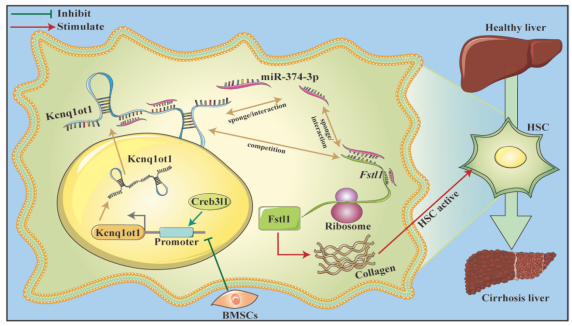 金世柱教授团队发现,在小鼠肝硬化组织标本及活化的肝星状细胞中,lncRNA Kcnq1ot1表达水平显著升高。深入研究发现lncRNA Kcnq1ot1表达水平可以被骨髓间充质干细胞的治疗部分逆转,同时受转录因子Creb3l1正向转录调控,lncRNA Kcnq1ot1通过miR-374-3p/Fstl1信号轴调控肝硬化及肝星状细胞的活化程度。在小鼠肝硬化模型中,敲低lncRNA Kcnq1ot1可缓解小鼠肝硬化严重程度。