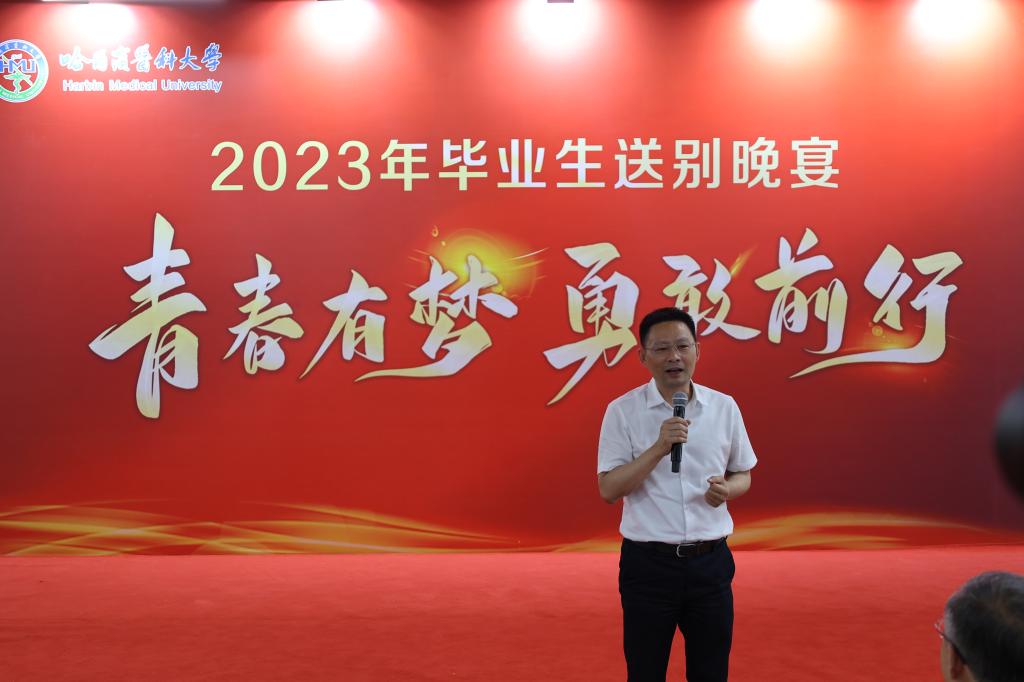 党委书记张学在致辞中满怀深情的说,2023届的同学们是生于千禧之年的一届,是战胜疫情挑战的一届,是开启新医科教育征程的一届,是经历国家新时代伟大变革的一届。来到校园,同学们勤奋求实,励志创新,取得了许多优异成绩,学校和老师由衷为大家高兴。同学们随学校发展,学校伴同学们成长。走出校园,同学们代表了母校的形象和风貌,更要以永不懈怠的精神状态、永不停滞的前进姿态,努力成为行业骨干、青年先锋,展现出新时代中国青年和哈医学子的使命担当。与毕业生一起包饺子、吃饺子,已经成为学校的传统和文化,饱含了学校对同学们的期待与祝愿。希望大家能够永远记住学校的味道、学校的情怀。无论是三年后的百年校庆,还是毕业十年团聚,同学们要常回家看看,逛逛明心湖,看看新校区,我们在学校期待大家成功的喜讯。