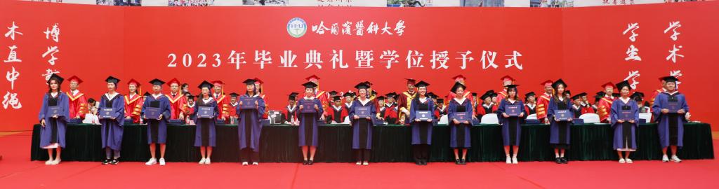 学位授予仪式在热烈欢快的乐曲中进行,到场被授予学位的应届毕业生和往届毕业生共计1700余人参加“拨穗”仪式。在拨穗环节,会场滚动宣读每位被授予学位的毕业生姓名,使本届毕业典礼厚植人文情怀,激励着每位即将开启新篇章的哈医大学子。