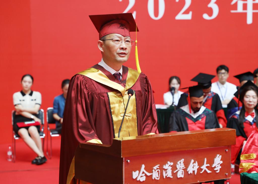 校长、校学位委员会主席季勇教授作了题为“挺膺担当砺青春医路奋斗建新功”的讲话。他代表学校向全体毕业生圆满完成学业致以最诚挚的祝贺,为即将奔赴到更广阔的未来的学子们送上最美好的祝福。他表示,学校特别邀请2020届、2021届和2022届毕业生代表回到梦想启程的校园,弥补因疫情而没能完成的大学生涯的“最后一课”,母校一直关心和牵挂着每一位哈医大人。