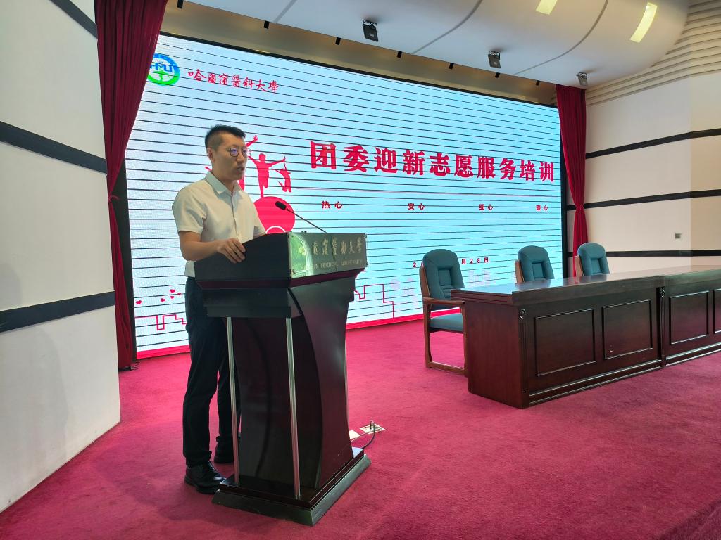 8月28日下午,校团委在主楼三楼会议厅召开迎新志愿服务培训会,团委书记王曦作动员讲话,王曦对志愿者提出详细工作要求,并鼓励大家用热心、爱心、细心、暖心的服务态度为2023级新生报到保驾护航。