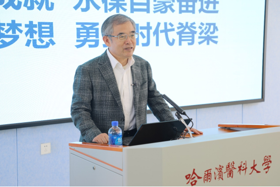 围绕传承与梦想,张学以“探寻百年哈医足迹,成就非凡大学梦想”为题通过四个板块讲述了哈医大的故事。一幅幅珍贵的图片、一个个感人的事迹、一部部漫长的历史、一句句谆谆的教诲,展现了百年老校的光辉岁月、展望了百年强校的梦想未来,勉励同学们赓续红色血脉,弘扬大医精神,勇担时代使命,成就卓越人生。