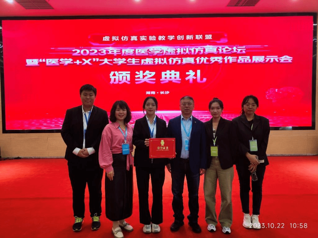 10月20日-22日,2023年度医学虚拟仿真论坛暨“医学+X”大学生虚拟仿真优秀作品展示会在长沙举行。我校公共卫生学院2020级预防医学专业本科曹娜、朱文琢、庄思佳同学、哈尔滨工程大学计算机专业刘子杨同学的作品《职业性痤疮虚拟仿真实验》脱颖而出,荣获全国银奖。本作品由解微实验师、吴永会教授共同指导完成。