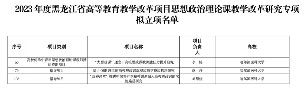 近日,黑龙江省教育厅下发了《2023年度黑龙江省高等教育教学改革项目思想政治理论课教学改革研究专项拟立项名单》,我校李婷老师的《“大思政课”理念下高校思政课教师胜任力提升研究》获批高校优秀中青年思想政治理论课教师择优资助项目;赵丹老师的《基于OBE理念的高校思政课沉浸式教学模式构建研究》、刘思佳老师的《“四种课堂”推进中国共产党精神谱系融入高校思政课的实施路径研究》分别获批指导项目。此次全省本、专科共计批准立项课题110项,重点项目10项、一般项目60项、指导项目40项。