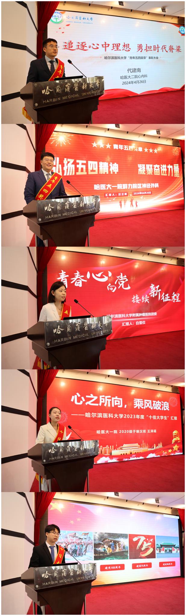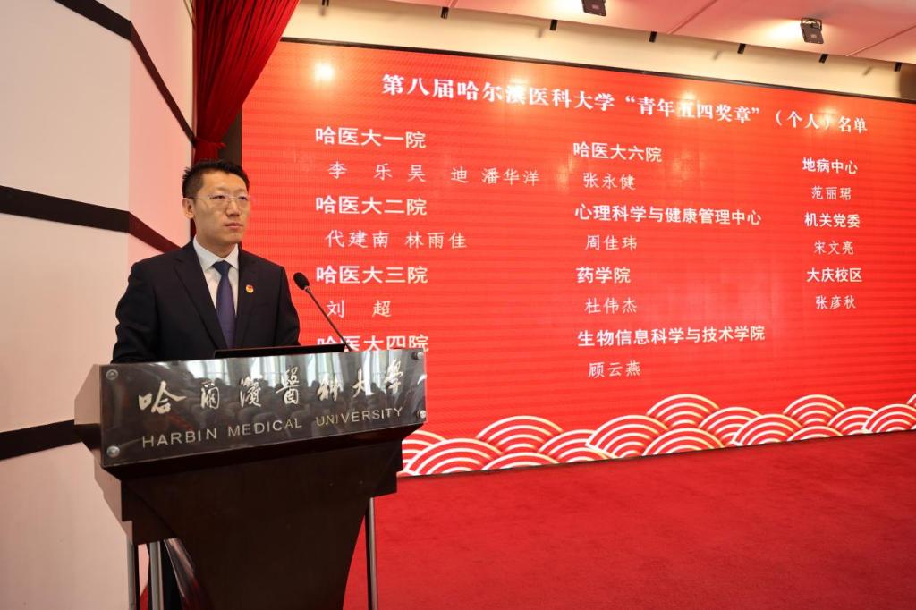 哈医大二院代建南作为“青年五四奖章”获得者代表、哈医大一院群力院区神经外科团队作为“青年五四奖章”获奖集体代表、哈医大三院团委副书记白雪佼作为“五四红旗团委”获奖代表、哈医大一院本科生王泽瑶、公共卫生学院博士研究生顾文博作为“十佳大学生”获奖代表分别进行发言。他们表示,恰逢实现百年医学强校梦想的决胜阶段,哈医大青年必将赓续红色血脉,弘扬大医精神,勇担时代脊梁,在躬身实践中真切地受教育、长才干、作贡献,用奋斗书写无愧于心,无愧于时代的青春篇章!