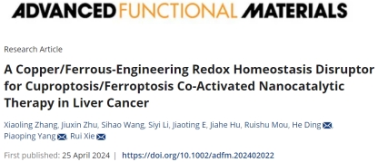 近日,哈医大肿瘤医院2022级博士生张晓领在导师谢蕊教授的指导下,以第一作者在《Advanced Functional Materials》(中科院1区TOP,IF:19.0)发表题为“A Copper/Ferrous‐Engineering Redox Homeostasis Disruptor for Cuproptosis/Ferroptosis Co‐Activated Nanocatalytic Therapy in Liver Cancer”的论文,在肝癌多模式协同治疗研究取得新突破。