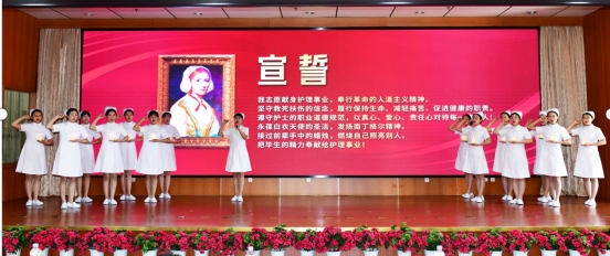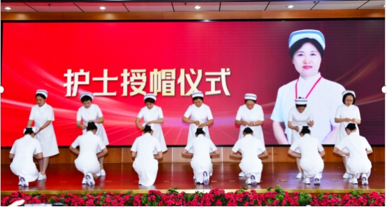 优秀护理人员代表们从对护理的热爱、自身成长、职业规划等方面发言,体现了新时代学校护理战线先进典型的担当和作为。大会现场进行庄严的护士授帽仪式,南丁格尔奖章获得者李秋洁教授和各附属医院护理部主任共同为新护士戴上圣洁的燕帽,见证她们这一庄严神圣的时刻。朝气蓬勃的护理新生力量庄严宣誓,谨记南丁格尔誓言,从护理前辈们手中接过传承南丁格尔精神的接力棒,继续发扬护理事业的光荣传统,走向圣洁的护理之路。随后,新入职护士向30年以上护龄的护理前辈们献花。