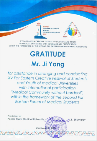 为持续深化中俄文化交流,以“中俄文化年”为契机,加强与俄罗斯远东地区医学文化交融,应俄罗斯太平洋国立医科大学邀请,我校学生代表团于5月21日-25日赴俄罗斯太平洋国立医科大学参加第二届远东医学生论坛暨第十五届远东医学生艺术节活动。