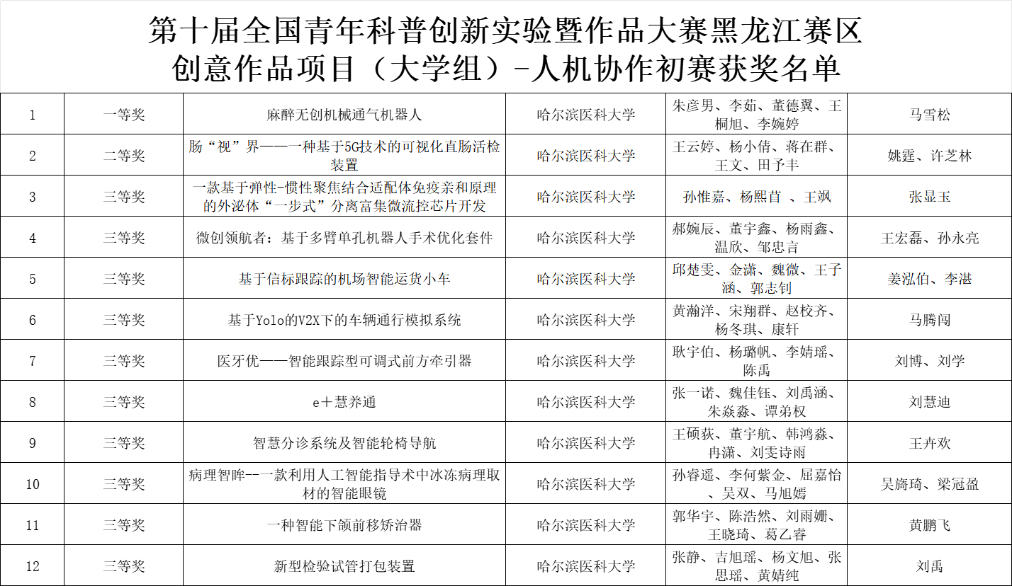 本次大赛由黑龙江省科学技术协会和省教育厅联合主办,黑龙江省科技馆承办,以“智慧、安全、环保”为主题,旨在提升青年学生的科学素养,激发创新精神,并培养实践能力。哈尔滨医科大学积极响应号召,共派出30支队伍参赛,经过初赛的激烈角逐,有12支队伍荣获奖项。