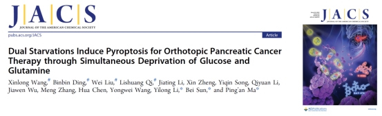 近日,哈尔滨医科大学附属第一医院孙备教授团队与中国科学院长春应用化学研究所马平安研究员团队合作开发了一种用于双重抑制葡萄糖和谷氨酰胺摄取诱导胰腺癌细胞焦亡的纳米药物,相关成果发表于《美国化学会志》(Journal of the American Chemical Society,影响因子:15)上,并入选为当期杂志封面文章之一。