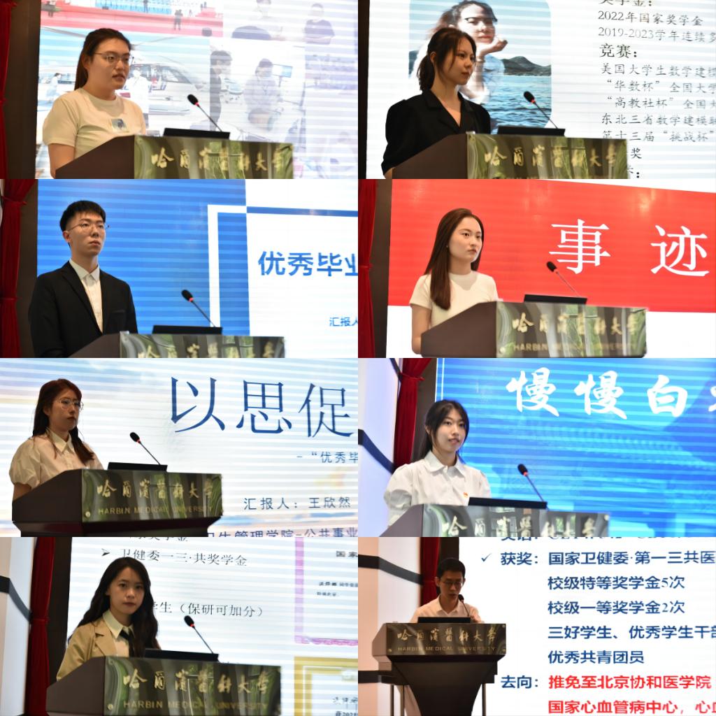 基础医学院李婧怡、生物信息科学与技术学院王金蕊、药学院高硕、公共卫生学院白轩、卫生管理学院王欣然、口腔医学院惠月、第三临床医学院洪烨娜、第四临床医学院张锐分别从学习、科研、竞赛以及工作实践等方面介绍自己大学本科阶段的成才经历,他们将自己宝贵的成长成才经验分享给学弟学妹们,并鼓励大家要做怀揣梦想脚踏实地的人,做拥有智慧富有激情的人,做德才兼备敢挑重任的人,要珍惜大学时光,不负青春,不负韶华。