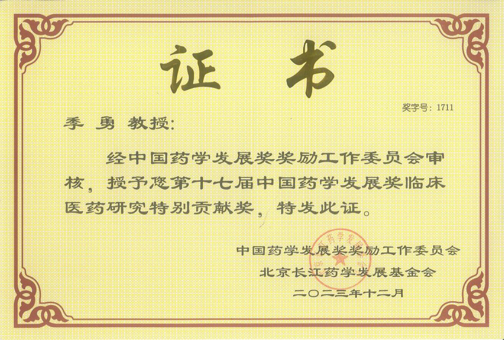 校长季勇教授荣获第十七届中国药学发展奖临床医药研究特别贡献奖