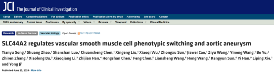 6月25日,我校寒地心血管病全国重点实验室季勇教授团队首次揭示了SLC44A2(溶质载体家族44成员2)在调控血管平滑肌细胞表型转化及主动脉瘤中的关键作用和分子机制;同时,发现了药物来那度胺可调节SLC44A2的表达从而在主动脉瘤中发挥保护作用。研究论文《SLC44A2 regulates vascular smooth muscle cell phenotypic switching and aortic aneurysm》发表在《The Journal of Clinical Investigation》(IF=13.3)。