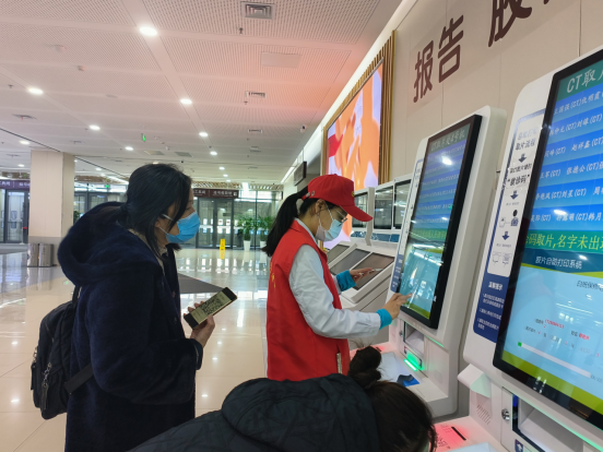 青年志愿者们主动迎接前来就诊的患者,微笑询问其需求,帮助填写表单,为不熟悉医院布局的患者提供准确引导。