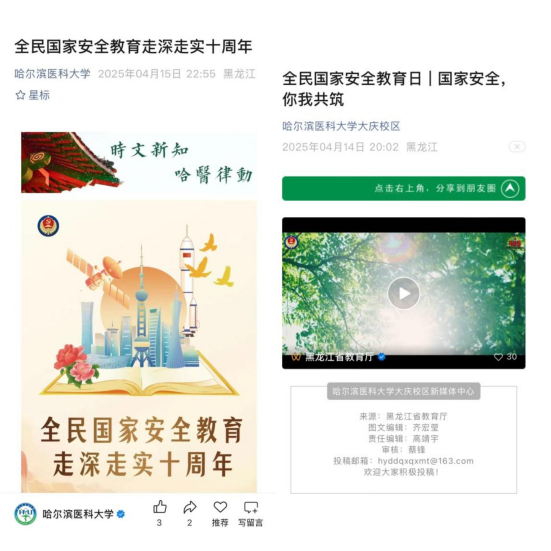 2025年4月15日是第十个全民国家安全教育日。连日来,哈尔滨医科大学深入贯彻总体国家安全观,广泛开展全民国家安全教育日系列活动,构建立体化国家安全教育体系,全校师生积极响应,通过党团班活动、公开课、知识答题、主题演讲、手抄报等形式,将国家安全意识融入日常,以实际行动维护国家安全,形成良好国家安全教育氛围。